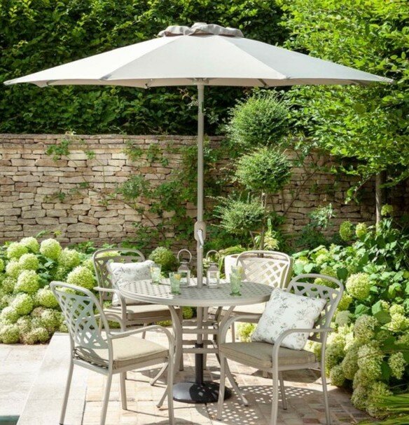 - Set includes: 1 x Round Dining Table, 4 x Dining Chairs, 2.5m Round Traditional Parasol (UPF50+ Certified) and 15kg Concrete Base (not suitable on some composite decking - check with your manufacturer)