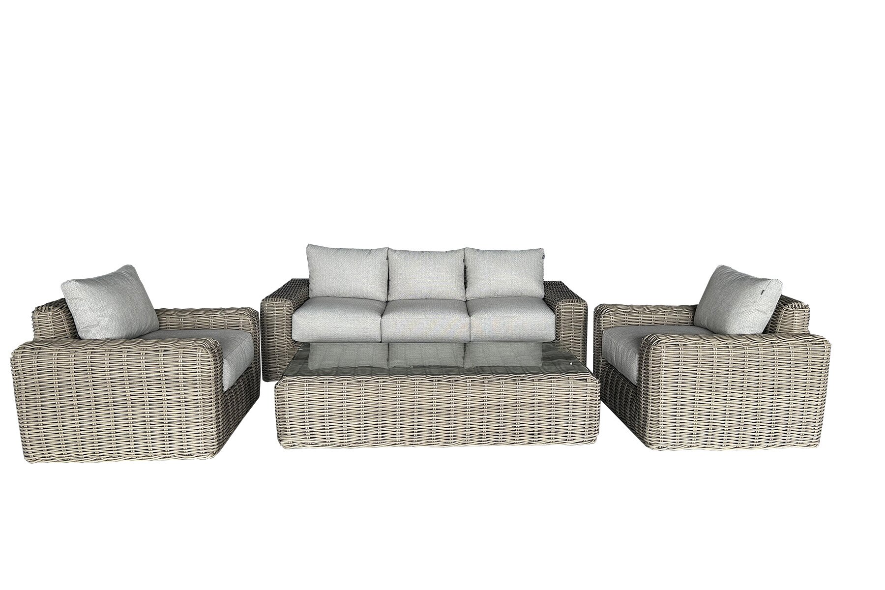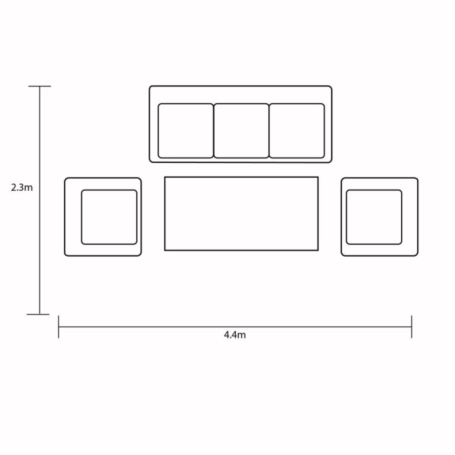 - Set includes: 1 x Rectangular Coffee Table, 1 x 3 Seat Lounge Sofa & 2 x Lounge Chairs