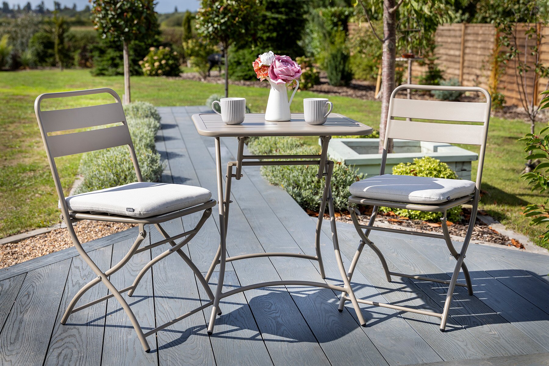 The set folds flat for effortless storage, making it a versatile choice for compact areas. Ideal for enjoying a quiet morning coffee or casual outdoor meals in comfort and style.